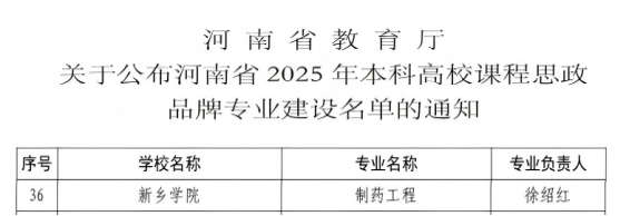 喜报!新乡学院制药工程专业获批河南省本科高校课程思政品牌专业建设项目